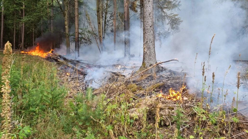 Vor Ort brannte der Waldboden auf rund 1.000 m², erschwert durch mehrere brennende Baumstämme und bereits in Mitleidenschaft gezogene Bäume. Die Brandbekämpfung erfolgte zunächst mit Feuerpatschen, Löschrucksäcken und Spezialwerkzeugen, unterstützt durch Löschwasser aus den Fahrzeugen sowie vorgefüllte Güllefässer der Landwirte.