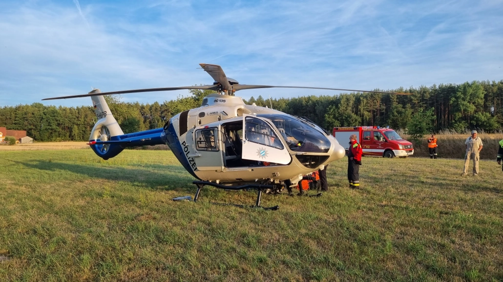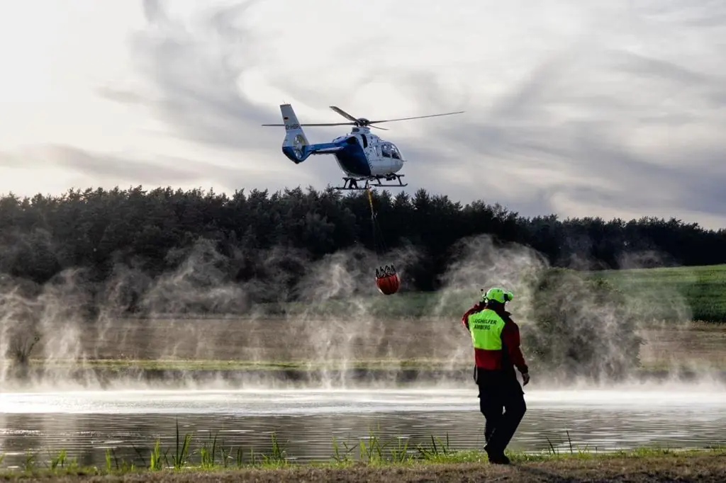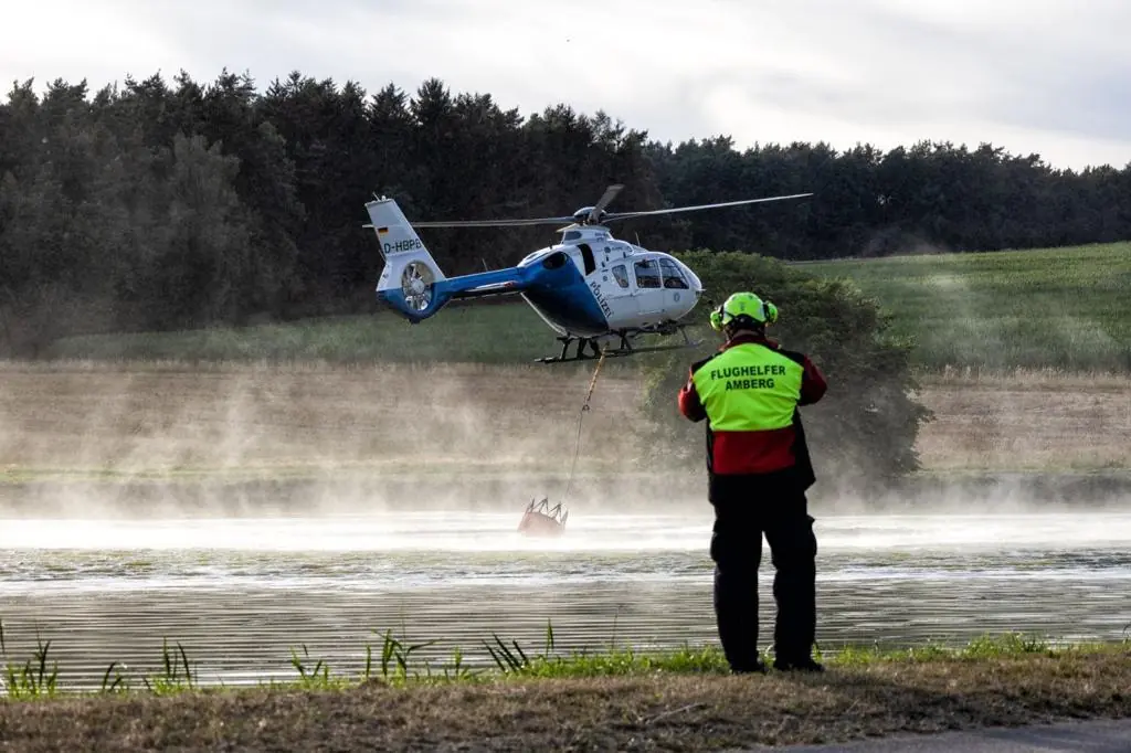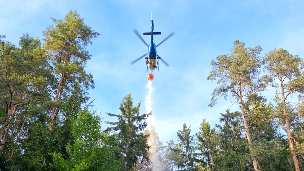 Zusätzlich kam die Luftunterstützung der Feuerwehr Amberg zum Einsatz: Ein Polizeihubschrauber (EC135) warf in sechs Anflügen Löschwasser über der Brandfläche ab.