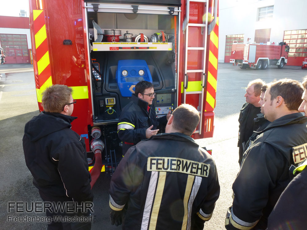 Nach der Ankunft in Leonding wurden zuerst die Ausrüstungsgegenstände auf Vollständigkeit überprüft und die Entnahme aus dem Fahrzeug getestet. Im Anschluss daran ging es an die Einweisungen am Fahrgestell und im praktischen dann an der fest verbauten Heckpumpe (N35)mit Schaumzumischanlage (Digimatic)